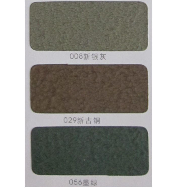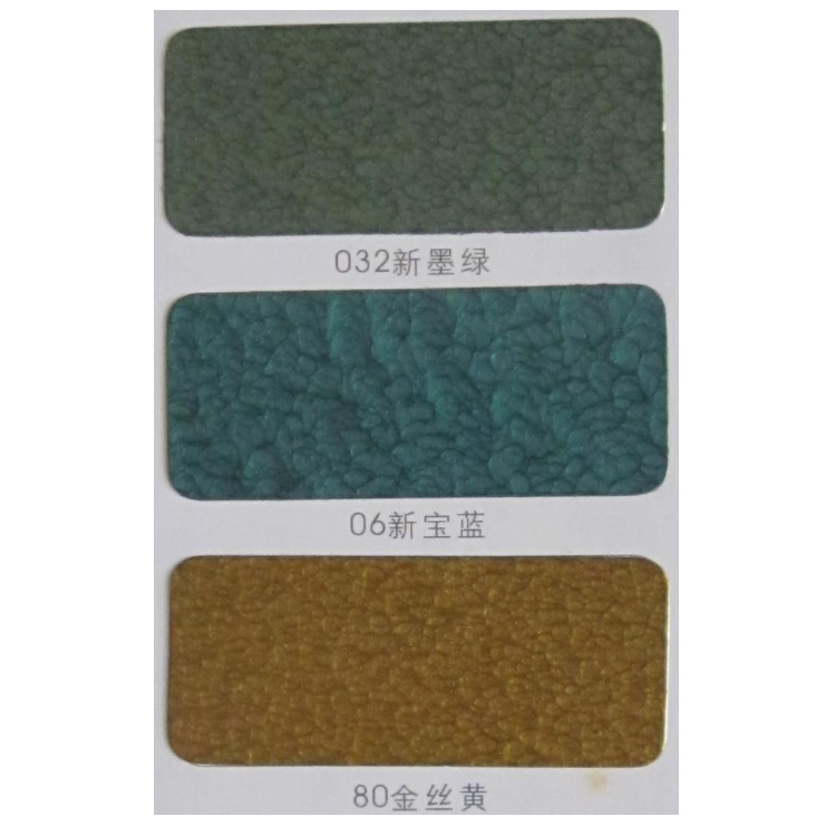 常规单组份锤纹漆的颜色品种有:新草绿单组份锤纹漆,新军绿单组份锤纹漆,新浅绿单组份锤纹漆,新翠绿单组份锤纹漆,新湖绿单组份锤纹漆,新嫩绿单组份锤纹漆,新橄绿单组份锤纹漆,新墨绿单组份锤纹漆,浅蓝单组份锤纹漆,蓝色单组份锤纹漆,新宝蓝单组份锤纹漆。颜色可调。